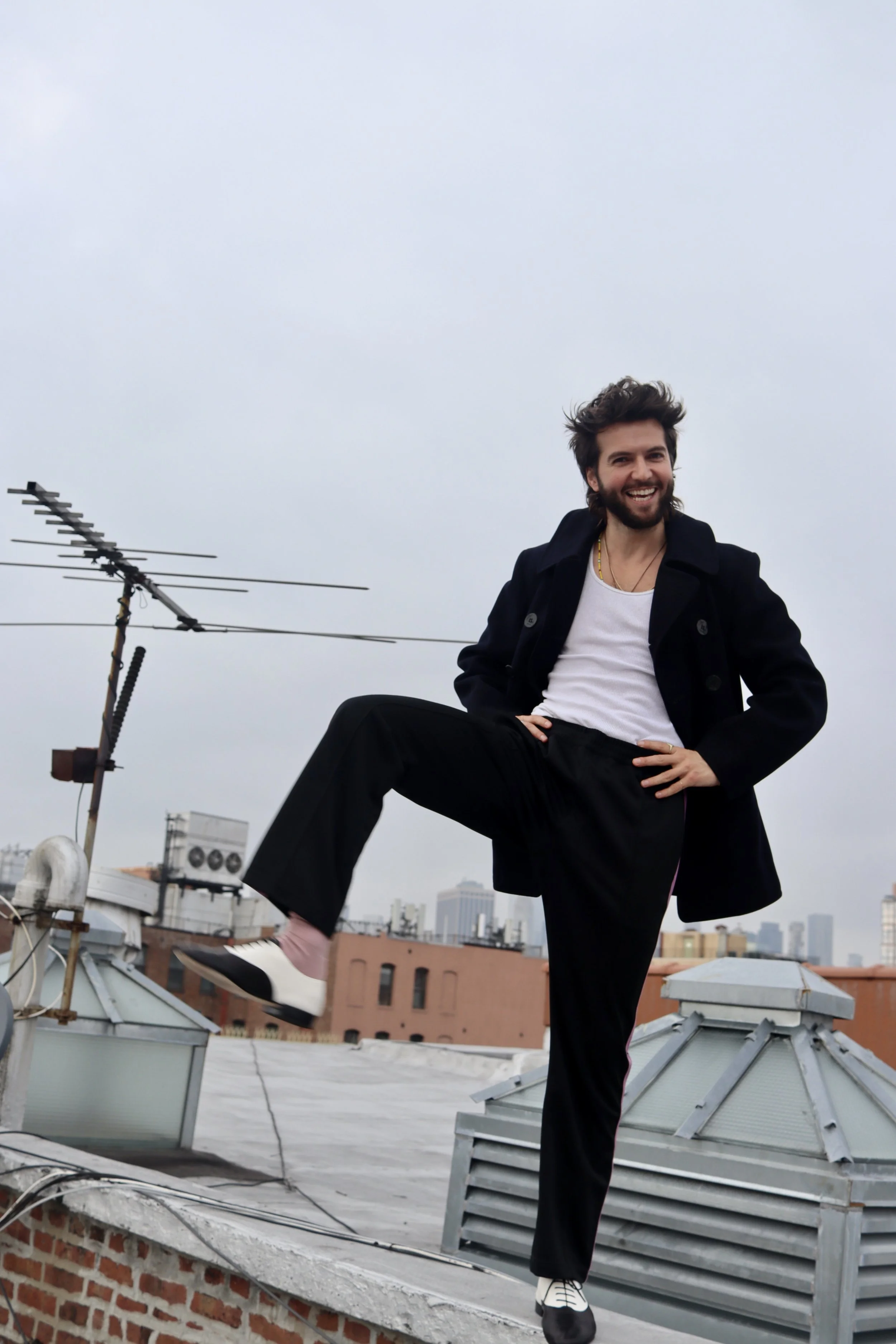 dashing and gifted Guy Burnet pops on the latest episode of the hit drama Landman playing engineer Charlie Newsom who stirs up some flirty action on a plane ride with Kayla Wallace's character Rebecca. check the sparks fly between them and Guy's compelling addition to Landman which has been renewed for another season. scroll on down get to know him a bit as he shakes it up in real life jumping on our brooklyn studio rooftop and sharing thoughts on this latest project, boxing, personal style/design and hitting the dance floor when he can.